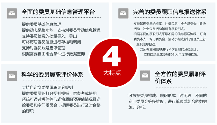 全面的委員基礎(chǔ)信息管理平臺提供委員基礎(chǔ)信息管理提供動態(tài)采集功能、支持對委員異動信息管理支持委員信息的批量導(dǎo)入、導(dǎo)出可將歷屆委員信息進行存檔和調(diào)閱支持對委員賬號啟停管理根據(jù)需要自由組合條件進行數(shù)據(jù)查詢科學(xué)的委員履職評價體系支持自定義委員履職評分規(guī)則提供委員履職打分規(guī)則模板,錦州網(wǎng)站建設(shè)供參考或使用系統(tǒng)可通過短信等形式將履職預(yù)評估情況推送給委員和專門委員會,提醒委員進行及時合格的履職。完善的委員履職信息報送體系支持管理委員的提案、社情民意、全會常委會、政協(xié)活動、社會公益活動等所有履職形式,根據(jù)不同的履職形式采取不同的信息報送流程,可由委員本人、專門委員會、活動小組或部門管理員進行履職信息報送對所有履職信息進行科學(xué)合理的分類統(tǒng)計支持自動生成委員的個人年度履職檔案全方位的委員履職評價體系可根據(jù)委員構(gòu)成、履職形式、時間段、不同的專門委員會等多維度,進行單項或組合的數(shù)據(jù)統(tǒng)計分析。